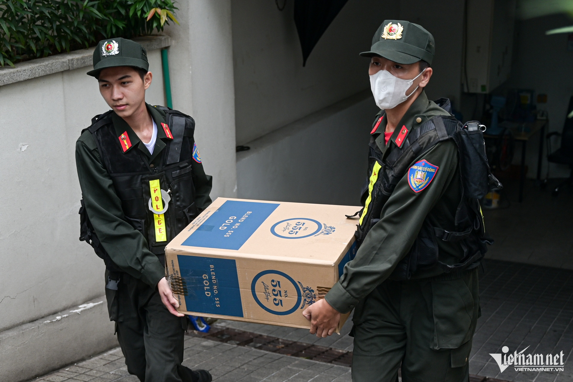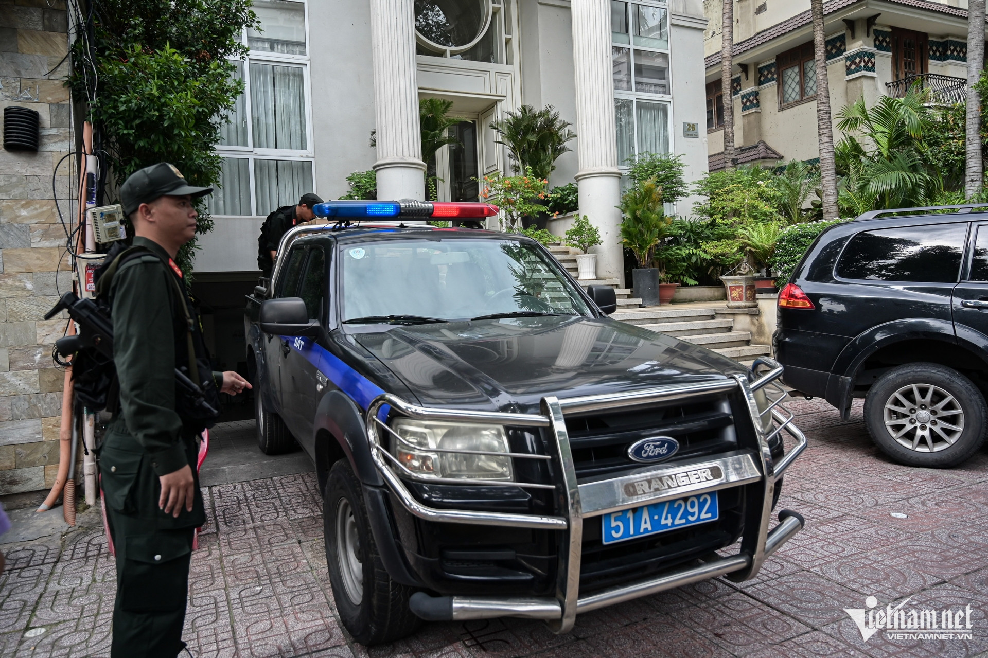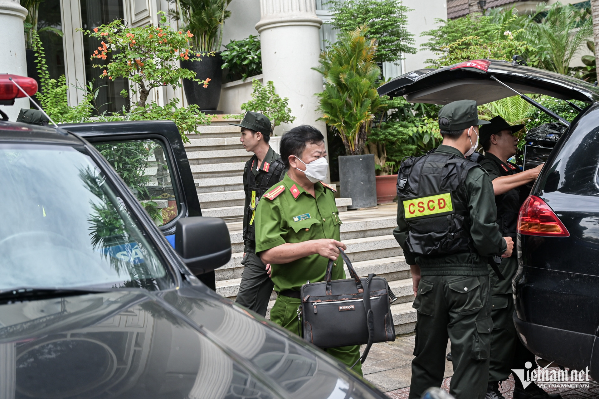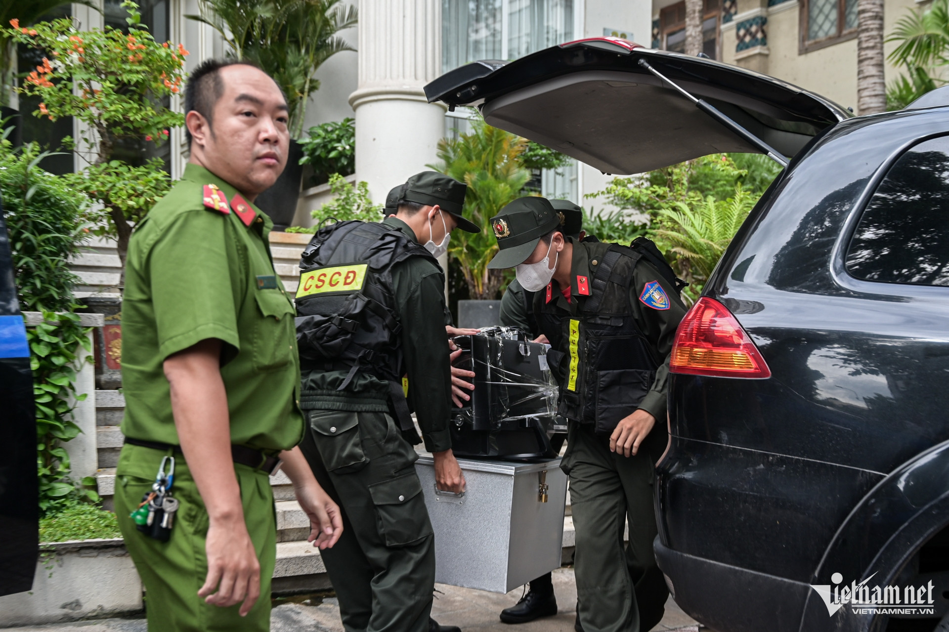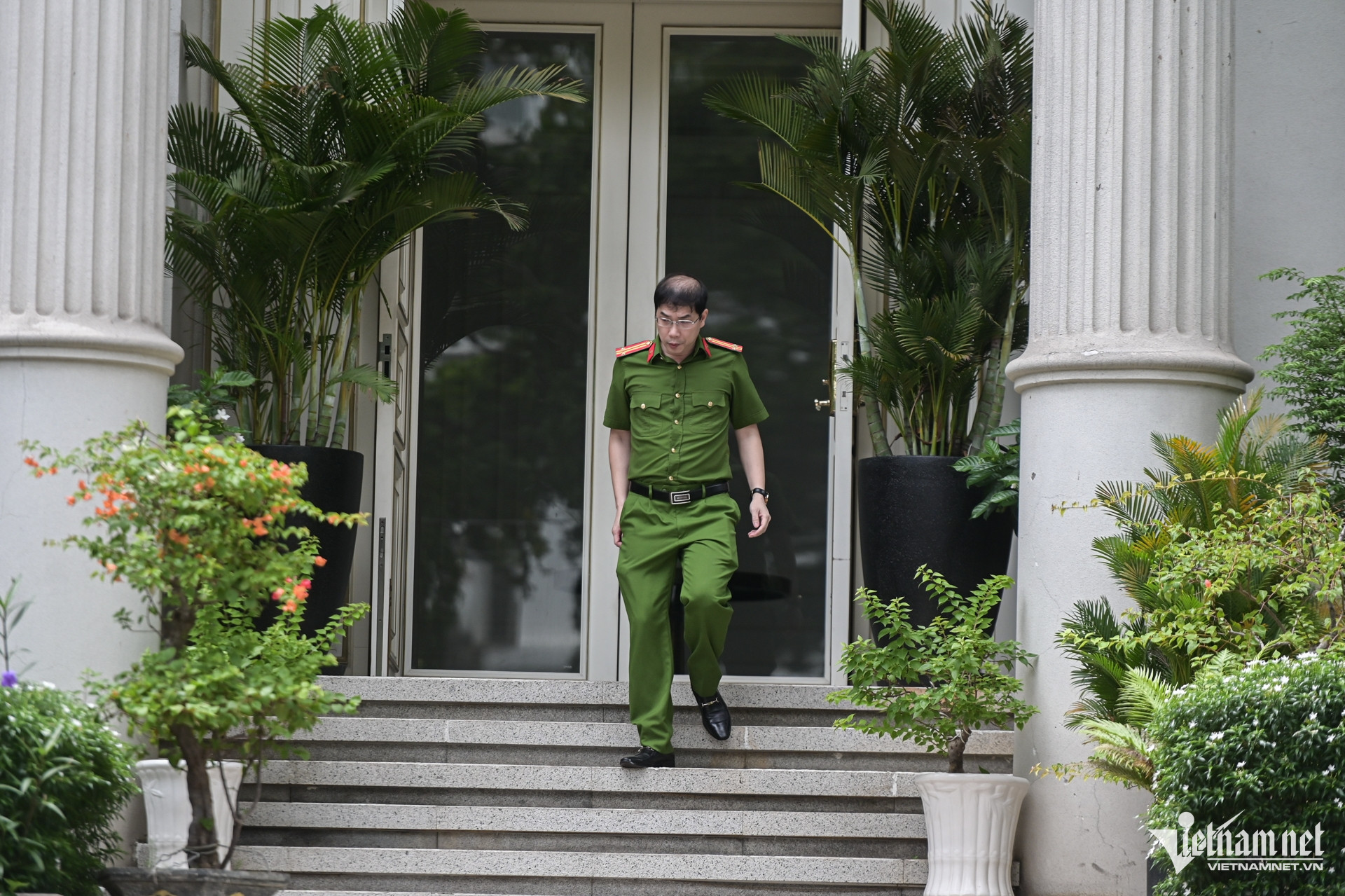 Theo quan sát của PV, lực lượng cảnh sát cơ động, điều tra viên, VKS đi vào khu biệt thự, làm việc tại các phòng. Cảnh sát nhiều lần đưa các thùng carton vào trong biệt thự, đựng tài liệu, niêm phong đưa ra ngoài từ phía hầm.