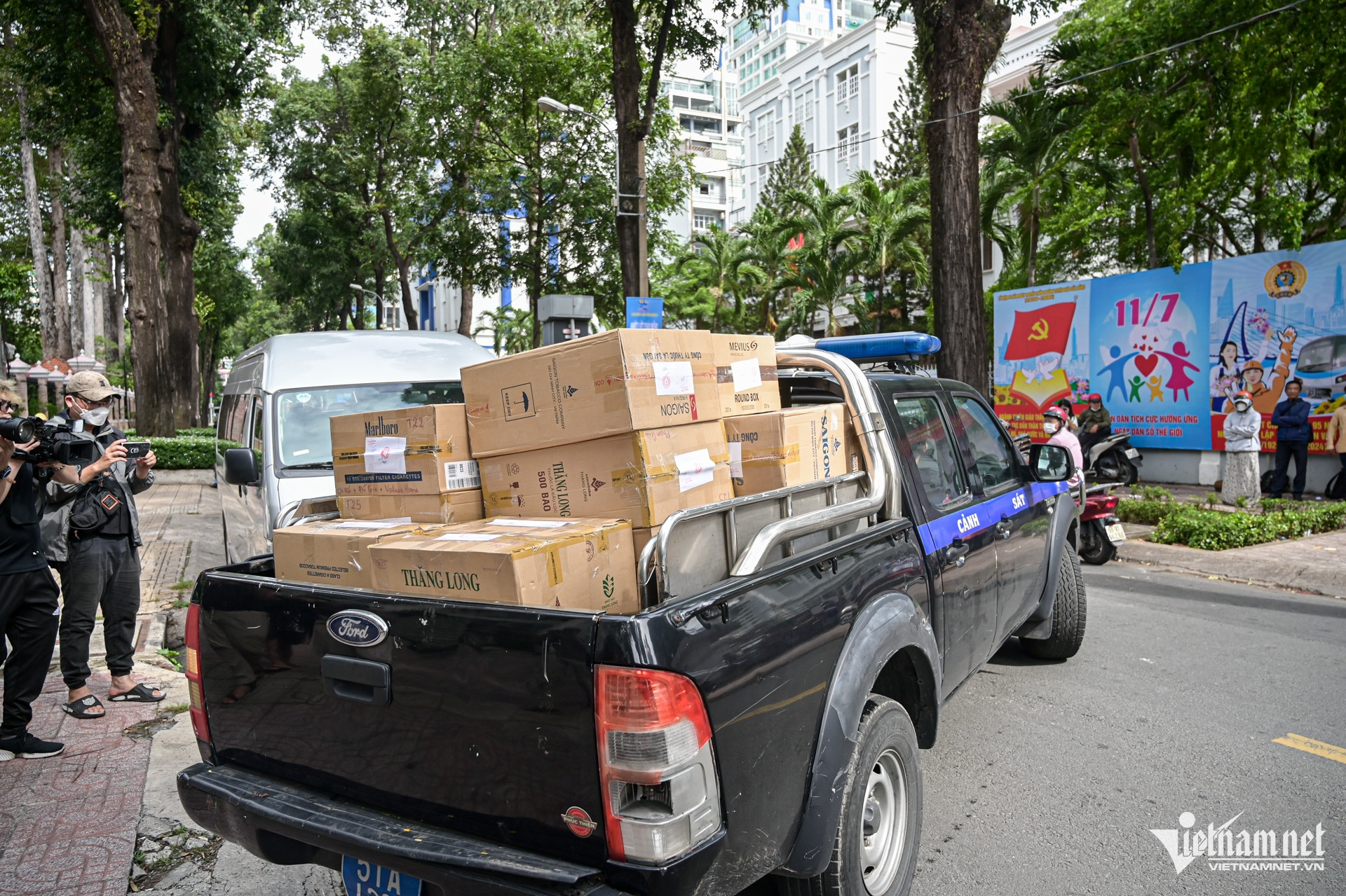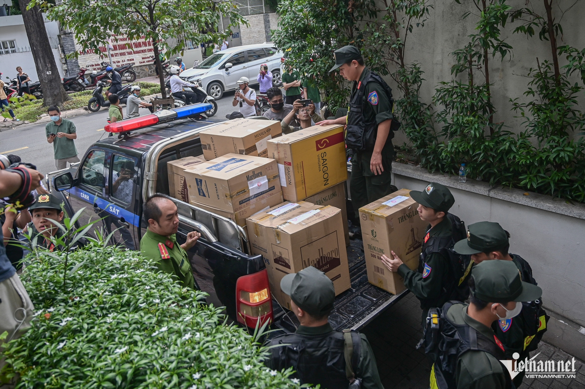 Đến 15h, nhiều thùng hồ sơ được cảnh sát đưa lên xe đưa về trụ sở cơ quan điều tra. Nhiều thùng tài liệu trong đó có cả các hồ sơ kế toán, giấy tờ được đóng dấu niêm phong.