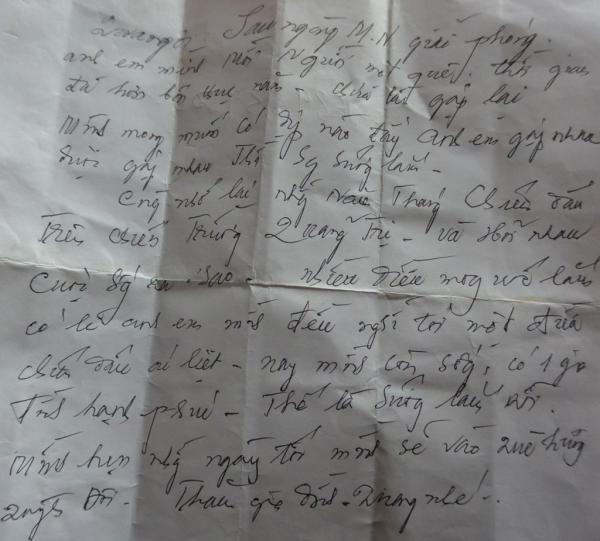 Bức thư ngắn, có lẽ cũng được viết trong tâm trạng cực kỳ xúc động của người lính khi hay tin về người đồng đội cùng chiến hào năm xưa. “Quang ơi! Sau ngày giải phóng miền Nam anh em mình mỗi người một quê. Thời gian đã hơn bốn chục năm rồi, chưa ngày gặp lại. Mình mong có ngày gặp lại, cùng nhớ lại những năm tháng chiến đấu trên chiến trường Quảng Trị và hỏi nhau cuộc sống ra sao. Nhiều điều mong ước lắm, có lẽ anh em mình đều nghĩ tới một điều: chiến đấu ác liệt, nay mình còn sống, có 1 gia đình hạnh phúc, thế là sướng lắm rồi. Mình hẹn những ngày tới sẽ vào thăm cậu, thăm quê hương Quỳnh Đôi, Quang nhé!”, vợ ông Quang đọc cho chồng nghe.